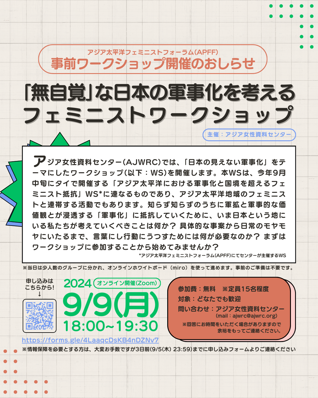 【報告会】10/16(木) APWLD地域会議報告会──アジア太平洋における軍事主義・帝国主義とフェミニスト抵抗 |