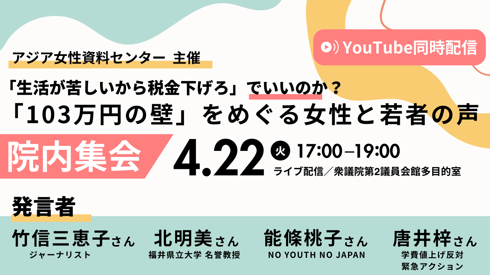 【無料アーカイブ配信中!】院内集会 「生活が苦しいから税金下げろ」でいいのか? 「103万円の壁」をめぐる女性と若者の声 |